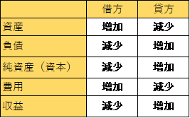 借方・貸方の仕訳ルールは次の表の通りです。このルールに則って記載していきます。