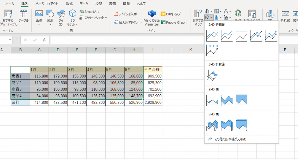 商品毎の折れ線グラフに月別の合計金額も入れたい場合は、合計を含めた1月から6月までの表全体を選択します。