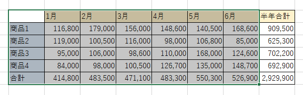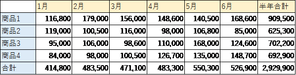 4商品の半年間の売上がどう推移しているかを見たい場合、まずは表を作成します。
