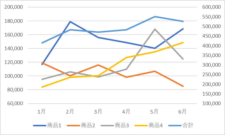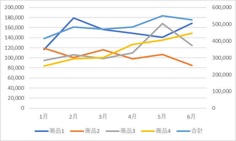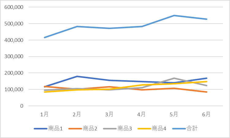 具体的な数値が把握しにくいのが折れ線グラフのデメリットです。例えば次のグラフのように、各商品の売上高と合計を合わせて折れ線グラフで表示させた場合、商品ごとの売上金額は分かりづらいです。