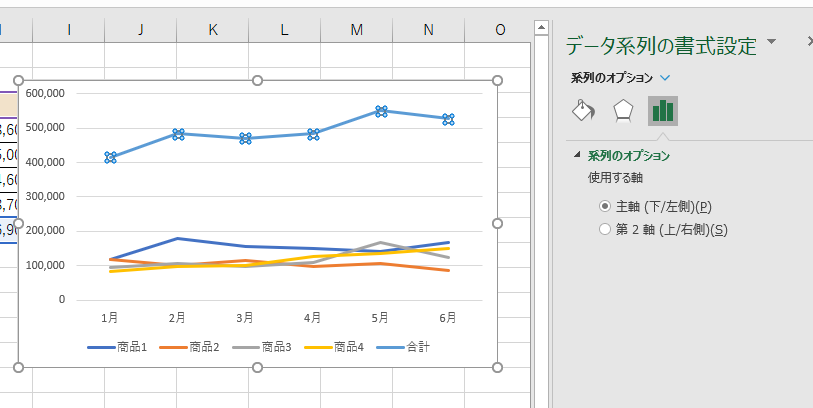 さらに、このままでは合計の桁が大きく、棒グラフの数値が分かりづらいため、合計の折れ線グラフは第2軸を使用します。