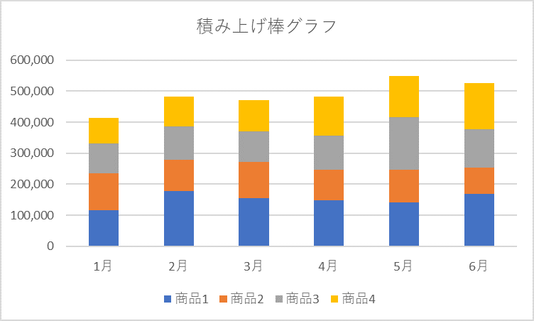 積み上げグラフは、複数の要素を1つの縦棒に積み上げて表示させます。合計に対してそれぞれの要素がどれくらいの割合になっているかが、色分けにより感覚的に分かります。