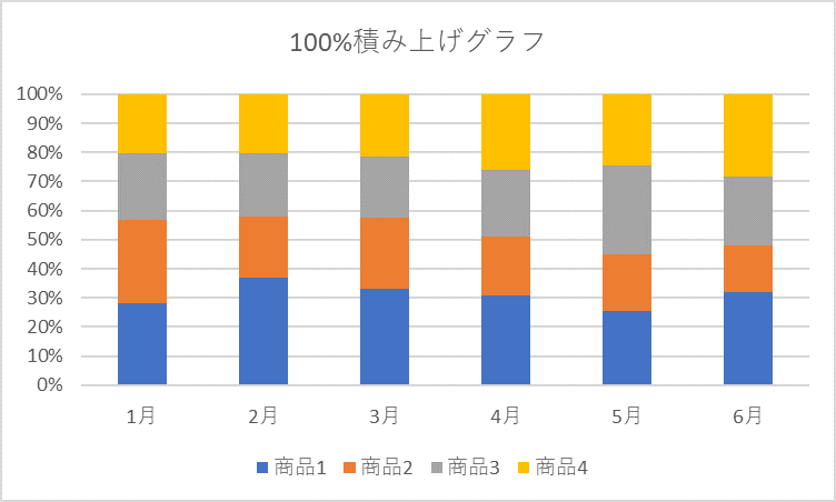 100%積み上げグラフは複数要素を合計値に関わらず同じ高さの縦棒で表現する形式です。