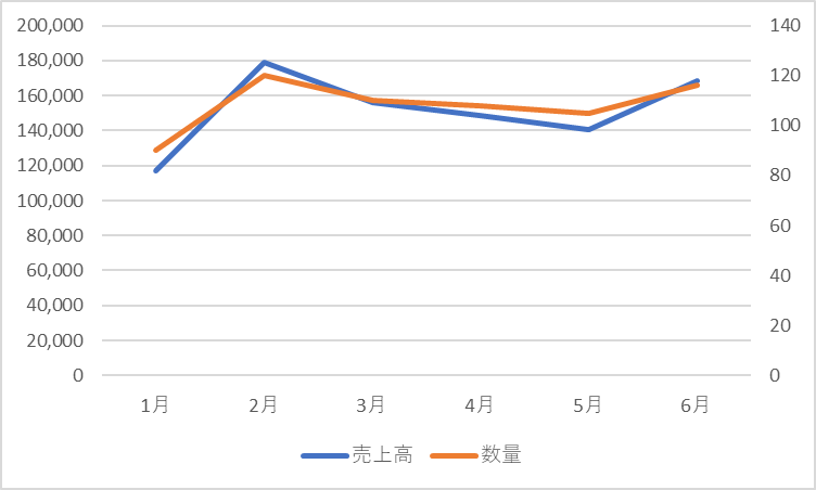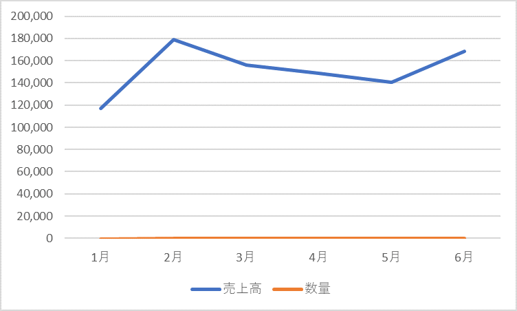 数字の桁が違う2つの折れ線グラフを、同じ縦軸を使って作成した場合、数字の大きい方は推移が分かりますが、値が小さい項目は変化が分かりません。