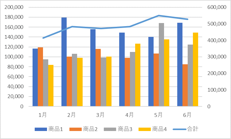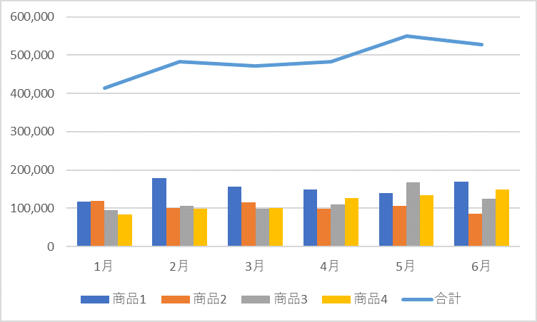 このような場合は、各商品売上を縦棒グラフにして、合計のみ折れ線グラフで表すのがおすすめです。
